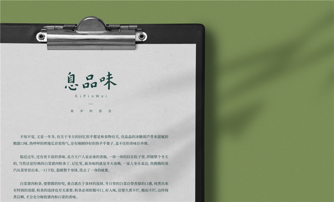 息縣,隸屬素有“江南北國,北國江南”之稱的信陽市,地跨淮河南北,四季分明,氣候濕潤,環(huán)境宜人,處處彌漫著自然的氣息。所以我們在為息品味進行品牌形象塑造時,盡量保持本真、自然的態(tài)度,不去刻意設(shè)計修飾,體現(xiàn)出弘一大師字體骨子里那種靜而不躁,文而不野,潤而不枯,簡而不繁的藝術(shù)境界,整體上呈現(xiàn)出樸實無華、自然本真的氣質(zhì)。
