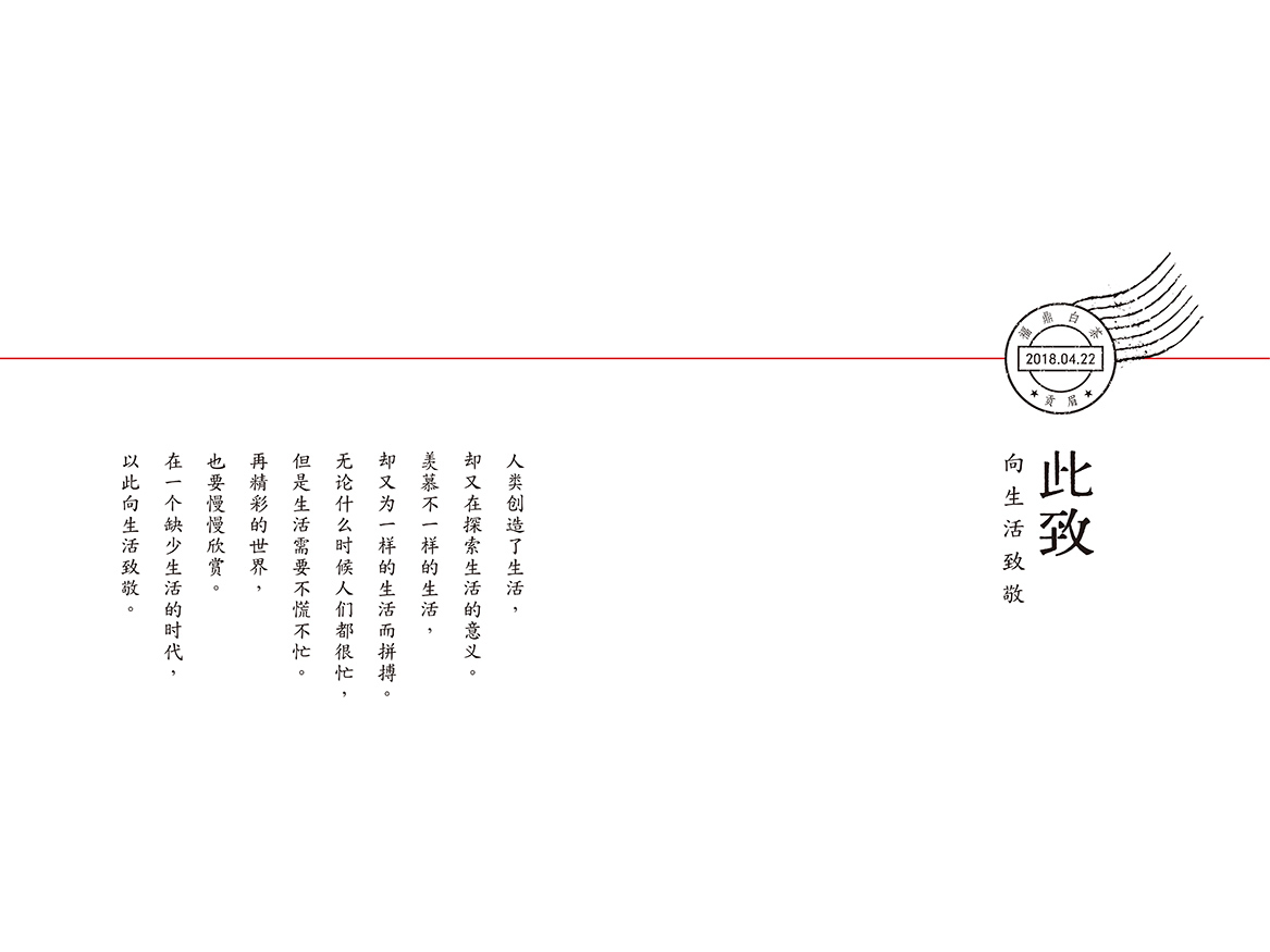 【此致】品牌最直接的聯想:書信,所以我們的創作就以從前書信的形式展開。從前“書信”是一種向特定對象傳遞信息、交流思想感情的方式,通過“書信”的形式不僅可以傳達品牌的思想感情,而且能給人以“見字如面”的親切感,喚醒我們每一個人對過去最美好的回憶,相比現代的數字化電子化更有溫度。并且“書信”這種形式高度契合木心先生的《從前慢》:“從前的日色變得慢,車、馬、[郵件]都慢,一生只夠愛一個人。”非常之美,意象中透著“從前”詞與物的美,與一個愈來愈快的對世界的感受相比,從前的慢直接轉化成一種美,一種好,一種樸素的精致,一種生命的哲學。創作形式融合了品牌概念并賦予品牌以靈魂。