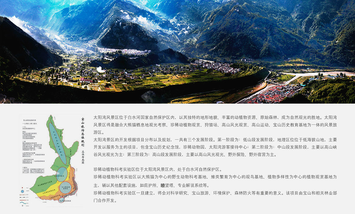 太陽灣風景區距成都市76公里,位于成都市西北國家級森林公園、國家地質公園、白水河國家自然保護區內,海拔高度1100–4200米。 景區植被保護完整、生物多樣性豐富,以其獨特的地形地貌、豐富的動植物資源、原始森林、奇特的天象奇觀和厚重的古蜀文化而成為自然觀光勝地。 風景區分為低山區、中山區和高山區三個部分,是融大熊貓棲息地觀光、珍惜動植物觀賞、高山和峽谷風光、科考及戶外運動、古蜀文化尋蹤、寶山歷史文化教育基地為一體的復合型風景旅游區。