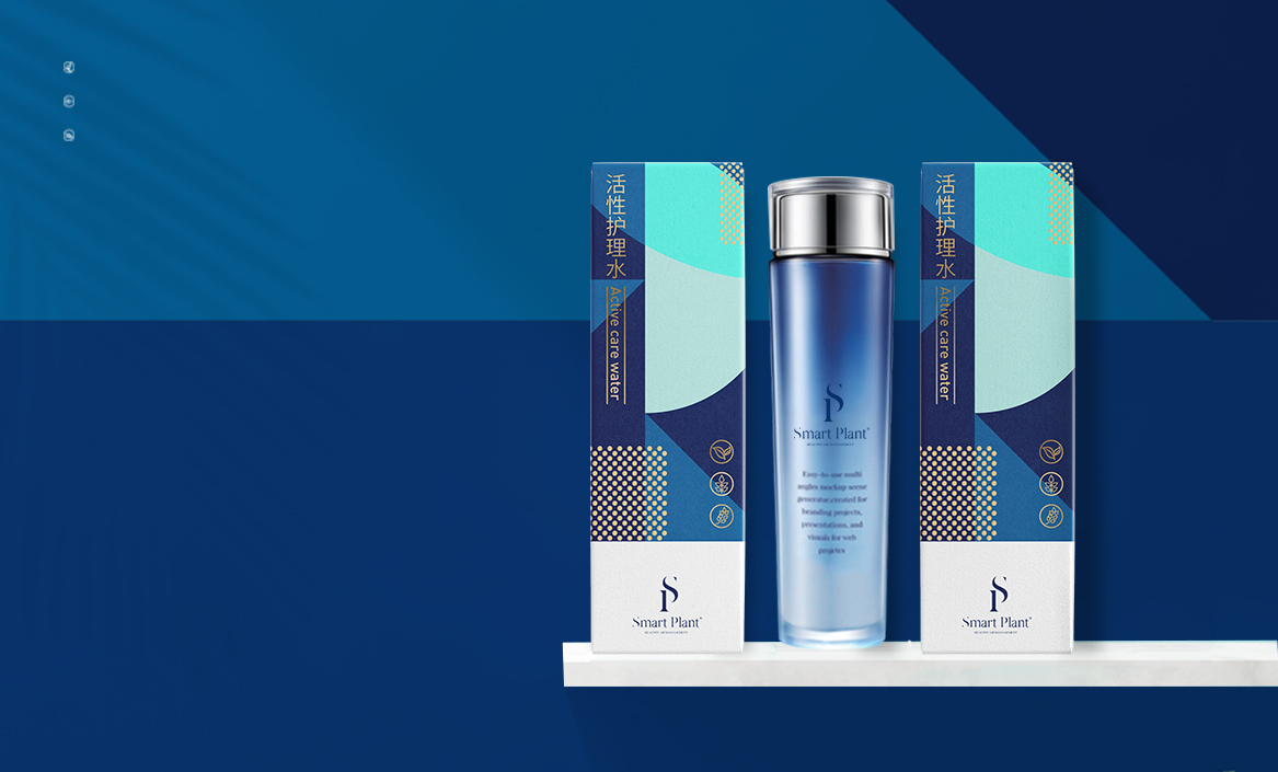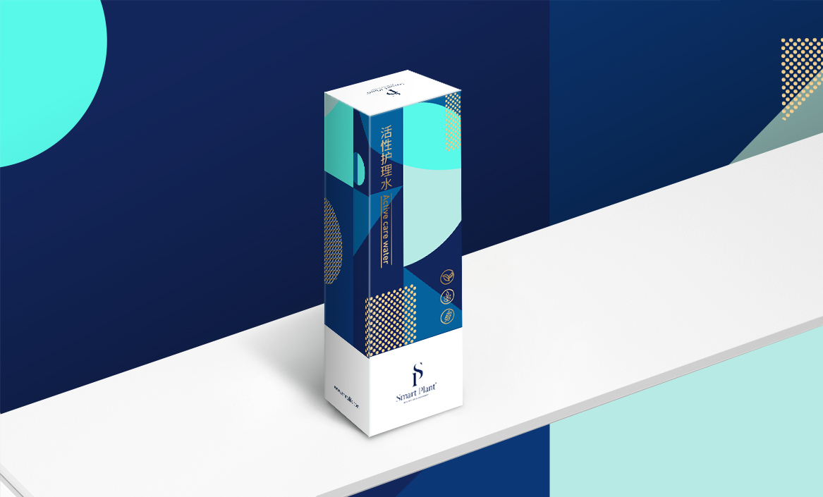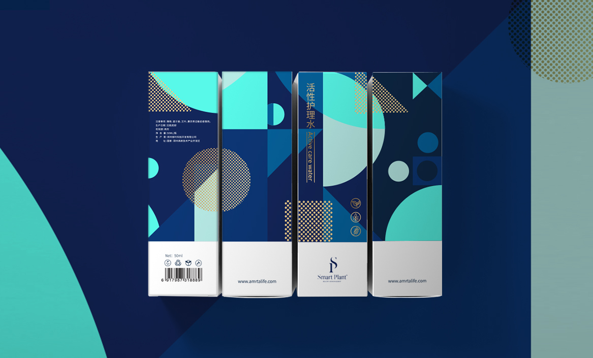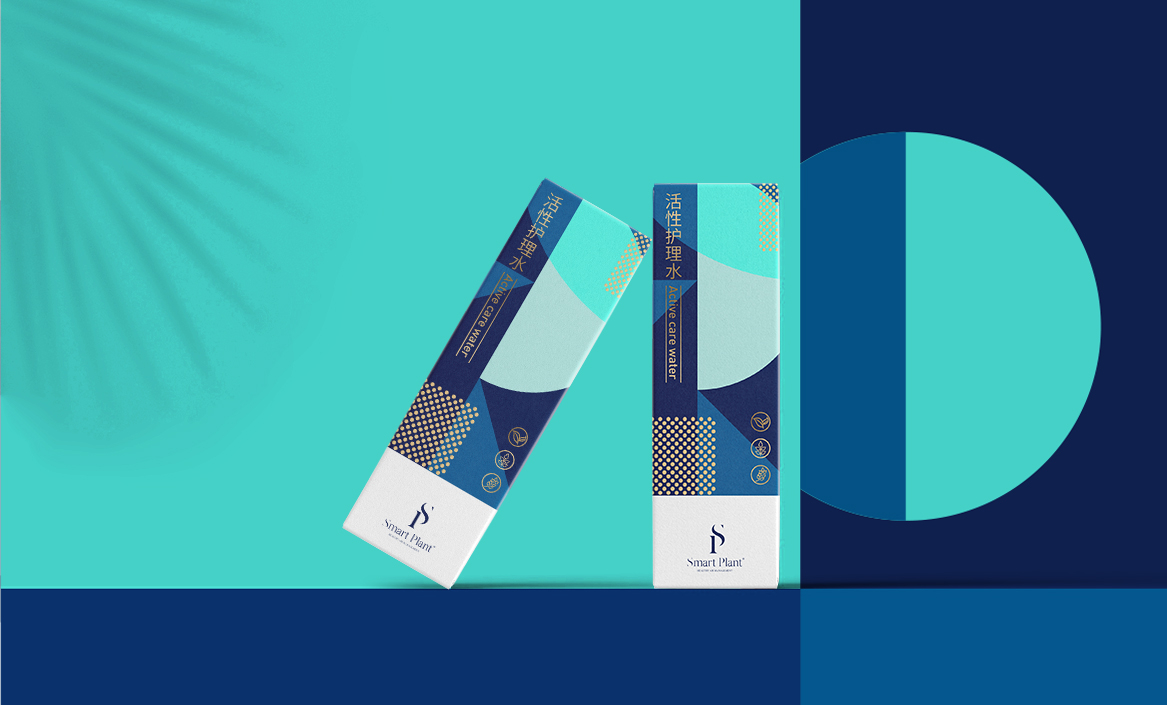 Smartplant是鄭州智慧藍生物科技有限公司旗下產品品牌,活性護理水是其中一款純天然植物提取的皮膚護理產品。此包裝風格定位:時尚、典雅、藝術、活力。設計表達上采用的是一種抽象化幾何化的表達方式,用圓、方、三角等極簡的幾何圖形表達不同的生活元素和自然構成,不同的藍色分別代表著藍天和大海,點狀代表活性水分子、新鮮的陽光和清新的空氣。包裝表達完整,體現定位,時尚亦不失活力。
