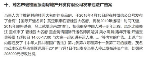 2019年,茂名市碧桂園發布“重金聘請國際開運名師黃楚淇風水講解、豬年開運、開運寶典簽贈”的廣告,因涉及迷信內容被罰20.5萬元。