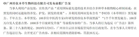 2019年,廣州珍儀本草生物科技有限公司發布含有“千年古方”、“黑發秘方”“讓你一生擁有永久黑頭發”等內容的虛假內容廣告,被罰款20萬元。