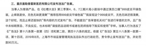 2019年12月17日,999皮炎平因在《吐槽大會》第三季第4、6、7三期片尾小劇場中通過演員口播廣告,但未標明禁忌、不良反應,也未標明“請按藥品說明書或者在藥師指導下購買和使用”字樣,被罰款90萬元。