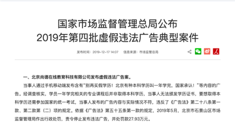 北京尚德在線教育科技有限公司在廣告中宣稱“一年學完,國家承認”,實際無法頒發學歷證書,被罰款27.93萬元。