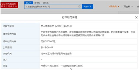 2019年6月4日,互聯網金融垂直搜索平臺融360母公司北京融世紀信息技術有限公司因含有“對未來收益進行保證性承諾”被罰款70萬元。