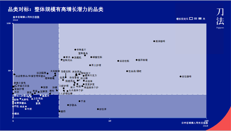 縱觀歷史之后,我們可以從數據的角度去分析品類機會。下面我們將中國跟美國和日本,進行品類人均支出和市場集中度的對標,篩選了一些我們認為有高增長潛力,和高市場集中度的品類。
