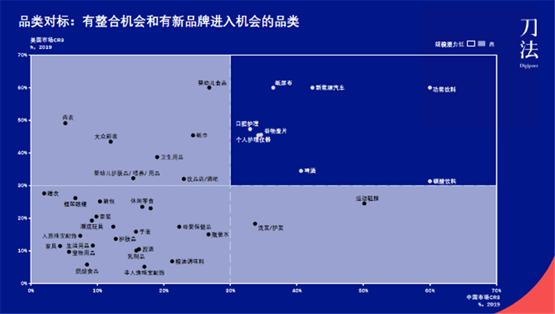 接下來我們從品類市場集中度的維度再做一下分析。這張圖里,橫坐標是中國每個品類前三名品牌的市場份額總和,縱坐標是美國每個品類里前三名公司市場規模的總和。