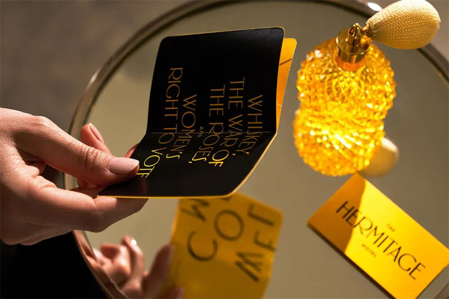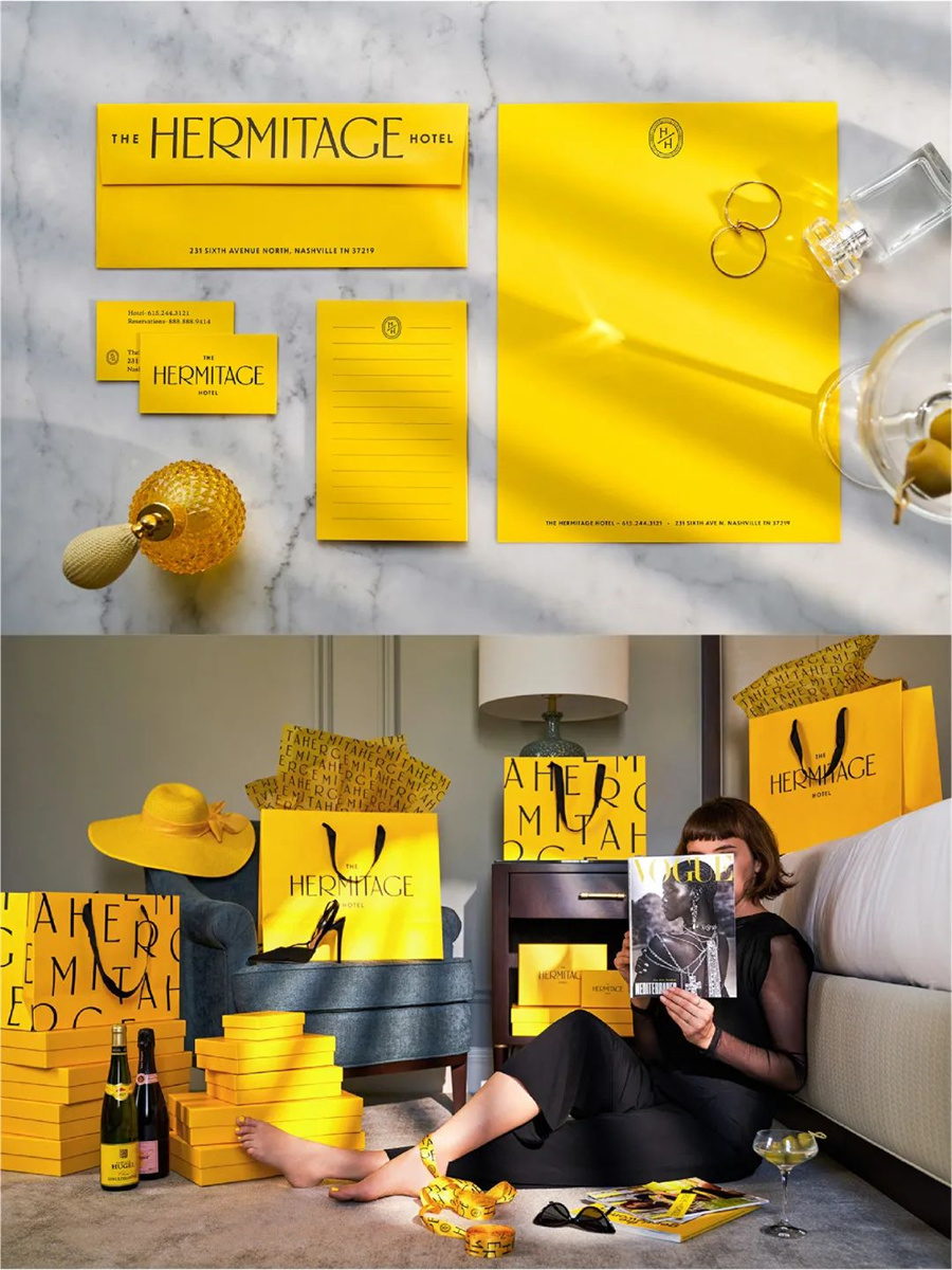 The Hermitage Hotel酒店品牌VI設計以大膽的黃色為主色調,襯托出酒店復古的氣質,“旅行的目的地不是一個地方,而是一個新觀點”,設計師秉承著這樣的觀點為此設計,打破常規酒店設計,那些探索世界各地欲望與沖動的旅客,會被這家擁有極具設計特色的酒店所吸引。