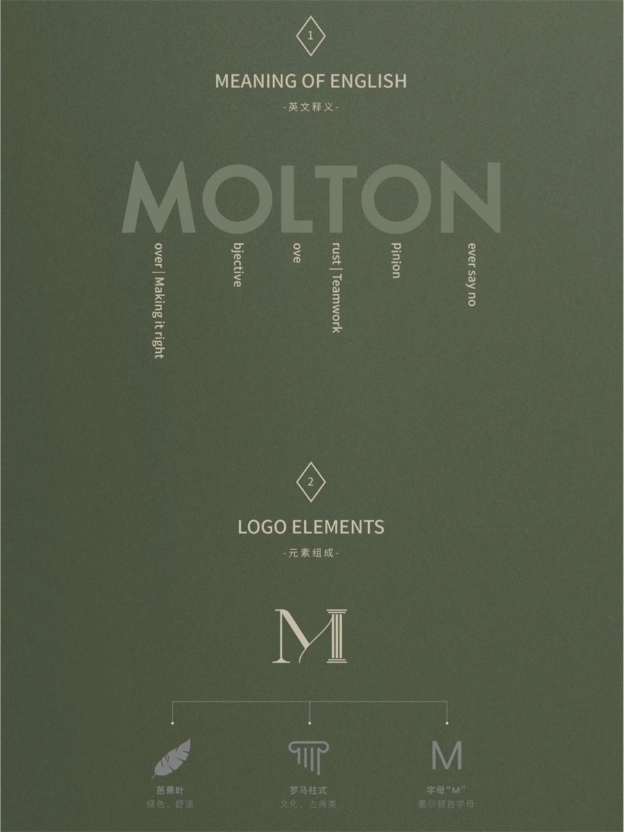 墨爾頓是一家源自澳洲的商旅度假酒店,本次項目需完成墨爾頓酒店品牌策劃設計,創作品牌LOGO設計和品牌形象設計,幫助其建立差異化視覺形象,傳遞品牌價值,提高品牌認知度。本案創意設計團隊以墨爾頓酒店的首字母“M”作為超級符號,將古希臘文字與古典的羅馬柱結合,用現代抽象化語言,以輕盈柔美的曲線線條勾勒芭蕉葉的結構,與澳洲現代文化里的輕盈、舒適的生活方式相對應,代表著墨爾頓傳達的現代生活方式。