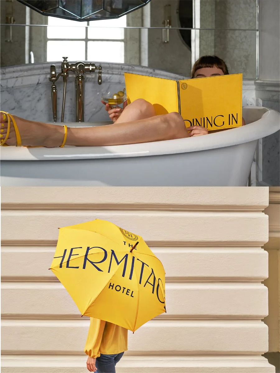 The Hermitage Hotel酒店品牌VI設計以大膽的黃色為主色調,襯托出酒店復古的氣質,“旅行的目的地不是一個地方,而是一個新觀點”,設計師秉承著這樣的觀點為此設計,打破常規酒店設計,那些探索世界各地欲望與沖動的旅客,會被這家擁有極具設計特色的酒店所吸引。