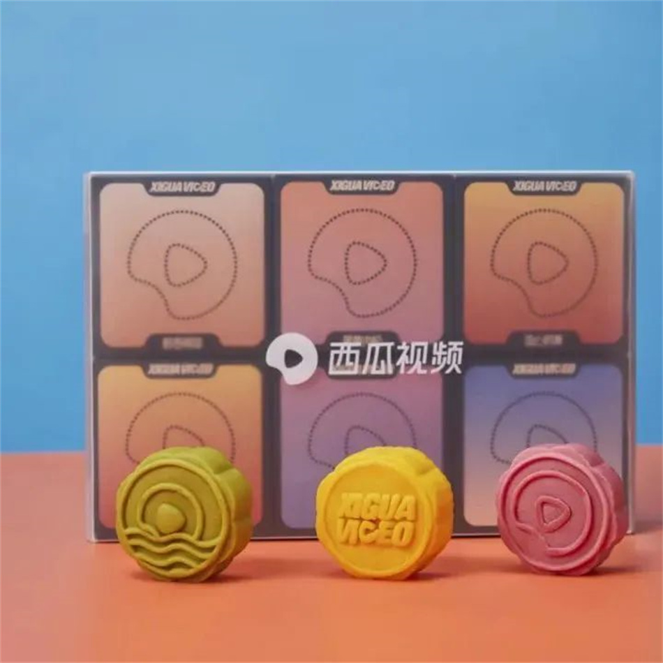 西瓜視頻今年的中秋禮盒包裝設計同樣玩味十足,盒面結合現代工藝與漸變色彩,通過特殊的噪點與模糊效果,營造出朦朧夢幻的場景,中心處則是企業LOGO設計延展,保持識別度之余,新鮮感拉滿!