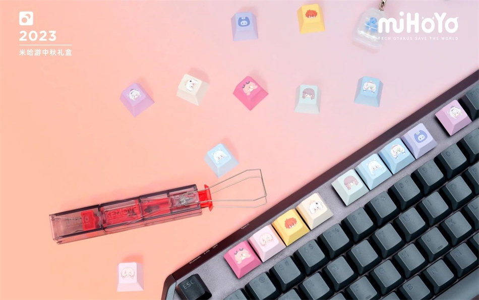 鍵帽套裝包含了9枚鍵帽、1個試軸器掛件及1個拔鍵拔軸器。鍵帽圖案為9款米哈游產品中的角色,統一的畫風全員可愛,安裝在鍵盤的功能鍵區域,陪伴打工人每一天。