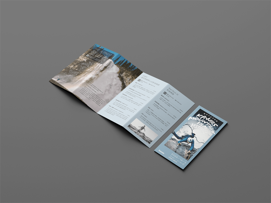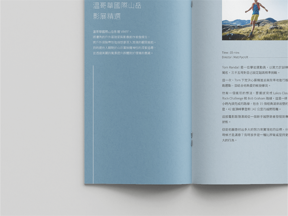 嘉瓦士山岳影展手冊設計主視覺使用 kawas 品牌藍色、戶外極限運動攝影照作為視覺元素,并通過畫冊排版設計設定,讓活動標題字與運動員的腳「跨越」四方規矩的畫面,傳遞山岳影展放映的紀錄片,讓受眾在有限的版面框架之間,開啟感官去感受影像中的每一分一秒,當視線追隨影片里的鏡頭轉移,能感受到運動精神,體驗無邊際、無極限的冒險旅程。