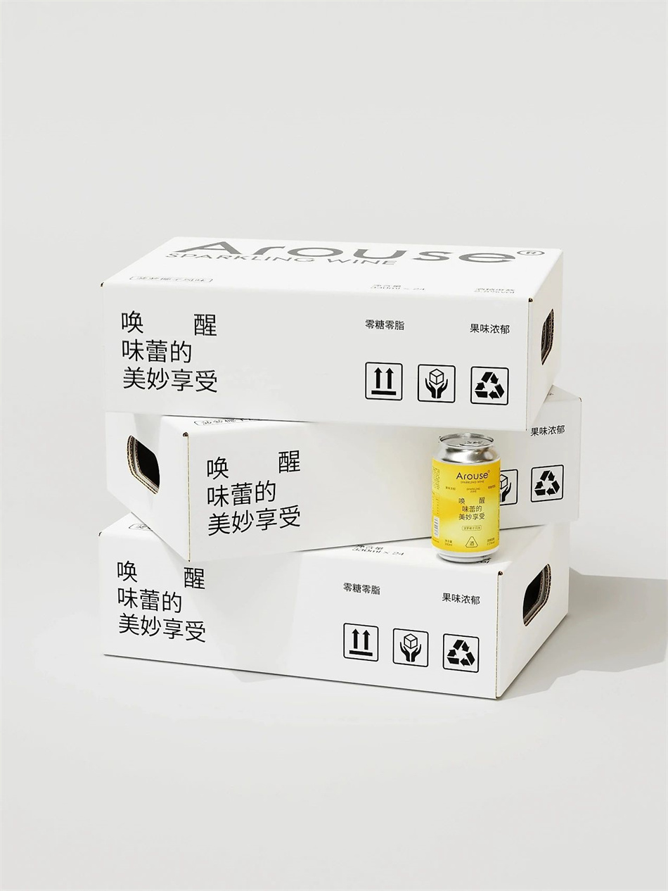 氣泡酒包裝設(shè)計版面布局則以簡潔的純文字編排為主,重點突出品牌名和slogan,讓顧客更直觀地感受到Arouse獨特的品牌魅力和時尚個性。
