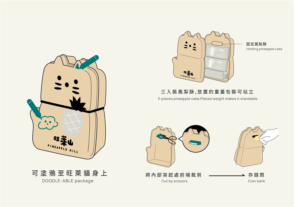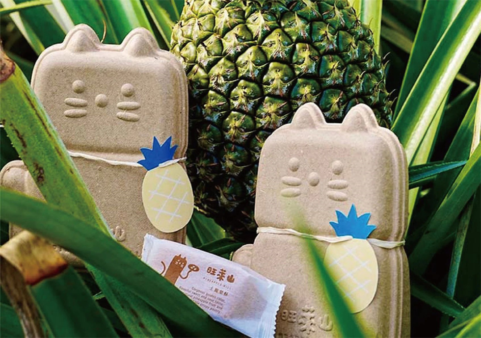 嘉義民雄舊名打貓,以旺萊山吉祥物為鳳梨包裝設計造型,運用在本次的設計當中,材質選用了100%的再生紙漿與鳳梨纖維制成,創造出具有環保特色且趣味的包裝設計,內部的固定結構可以轉化成存錢筒的功能,并可以自由涂鴉創作,將循環設計的特性發揮到極致。嘉義是臺灣鳳梨品種的發源地,運用包裝設計全循環理念提升鳳梨附加價值,讓鳳梨產業更具愿景。從鳳梨酥碳足跡、鳳梨農廢余料處里、設計及循環再生開發,展示鳳梨全果應用價值,希望能翻轉傳統水果食材,促進鳳梨余廢循環經濟新價值。旺萊喵鳳梨設計上以可持續性為核心,鳳梨纖維是一種天然、可再生的資源,其結合了纖維的強度和鳳梨的天然特性,融合創意與多功能性,打造獨特而令人驚艷的體驗,更是要通過功能和使用者體驗來提供價值,可愛的貓咪造型令人在視覺上有為之一亮的感覺。
