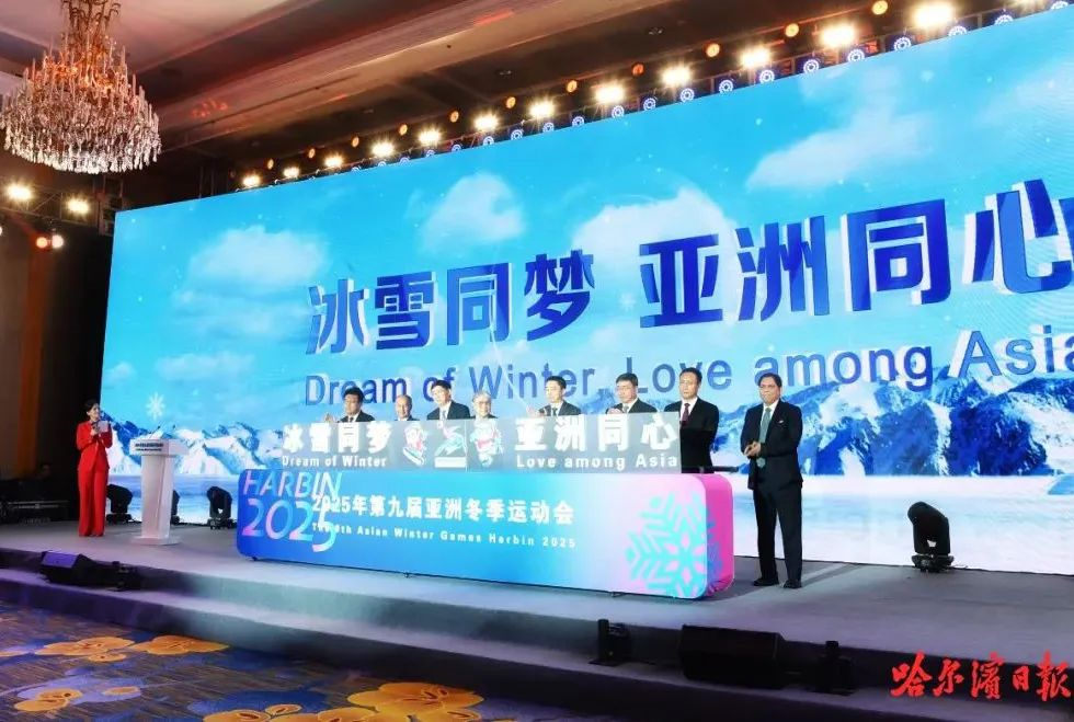 亞奧理事會副主席、協調委員會主席霍震霆,中國奧委會副主席、第九屆亞冬會組委會副主席、國家體育總局副局長、黨組成員周進強,第九屆亞冬會組委會副主席、黑龍江省政府副省長韓圣健,第九屆亞冬會組委會副主席、黑龍江省政協副主席、省體育局局長錢福永,第九屆亞冬會組委會副主席兼秘書長、哈爾濱市委副書記、市長張起翔等領導出席儀式,并共同啟動裝置為2025年第九屆亞洲冬季運動會口號、會徽、吉祥物揭幕。此外,本屆賽會的口號、會徽、吉祥物宣傳片也首次正式對外公開。