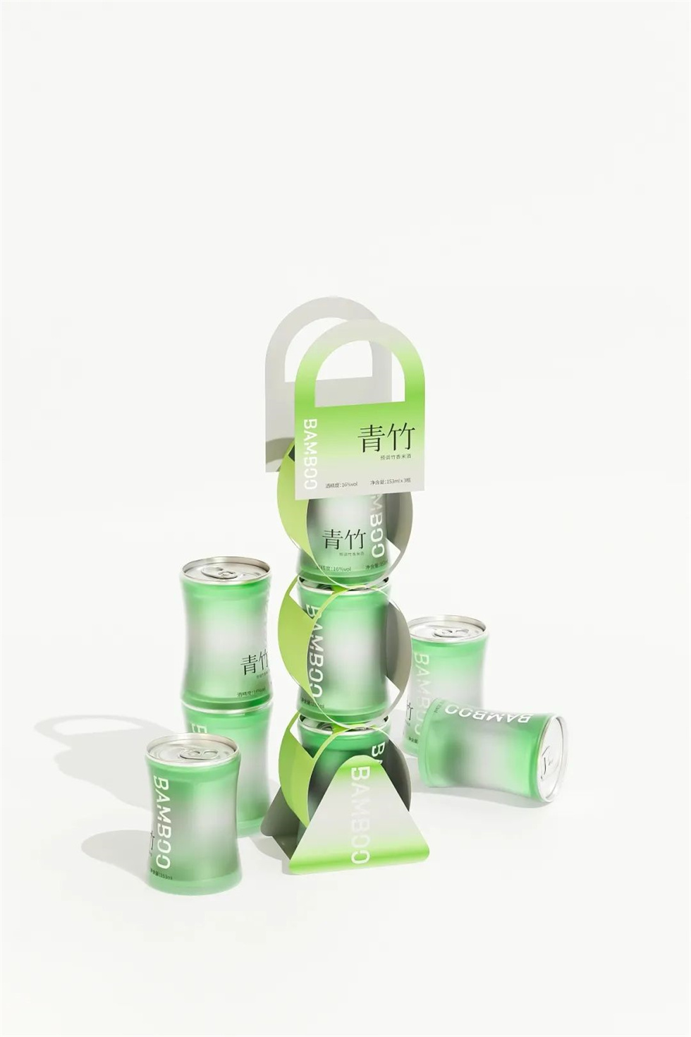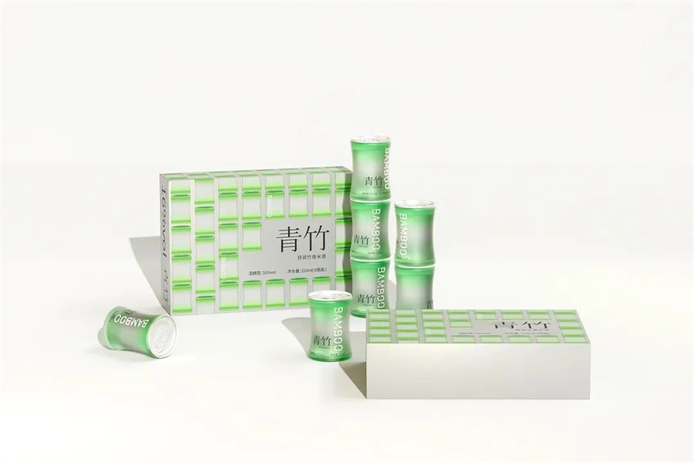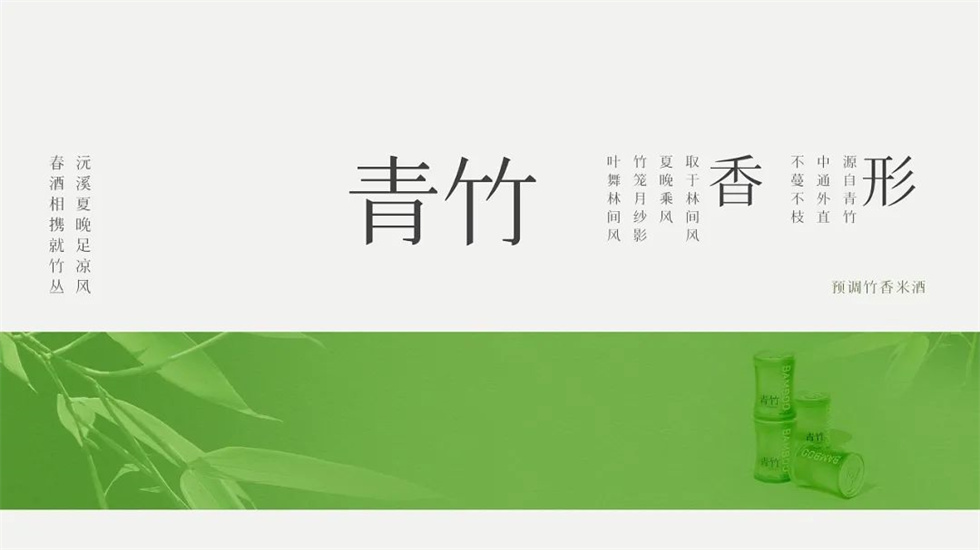 青竹-預調竹香米酒開篇就被竹子外形的酒吸引住,整體米酒包裝設計如其名--「青竹·預調竹香米酒」,不僅在瓶型設計上參考竹子外觀,以中通外直的線條還原一節的“竹子”形狀,還將竹香味融入到米酒當中,希望用戶從外層包裝設計視覺到品味酒本身,都能感受到清香淡雅的竹香。