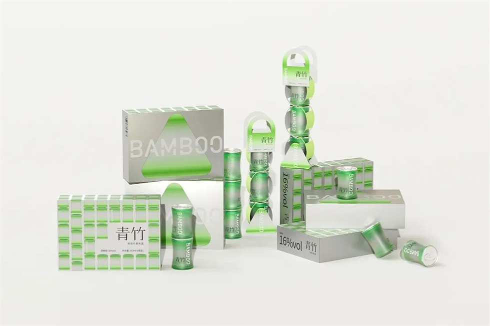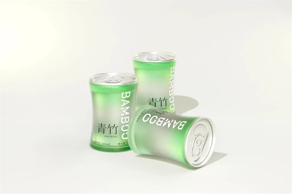 為了營造更真實的視覺效果,米酒包裝設(shè)計外觀還提取了竹子的青綠色調(diào),結(jié)合漸變等工藝增強產(chǎn)品的“竹子”屬性,當(dāng)產(chǎn)品擺放在貨架上,猶如走進竹林一般,極具沖擊力。