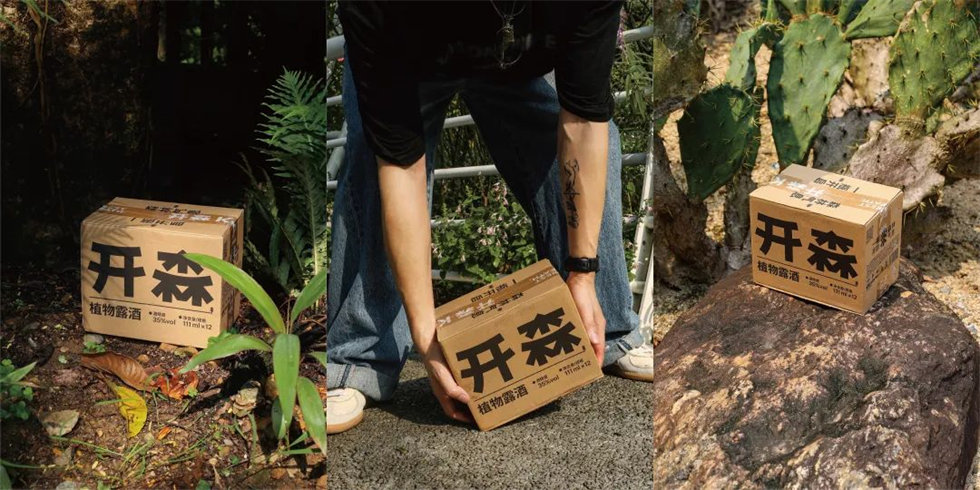 開森®植物露酒包裝設計由“開心”的暗喻延伸到“森林”概念,品牌以“一口開啟森林氣息”為slogan,致力于為用戶帶來全新、有趣的白酒。