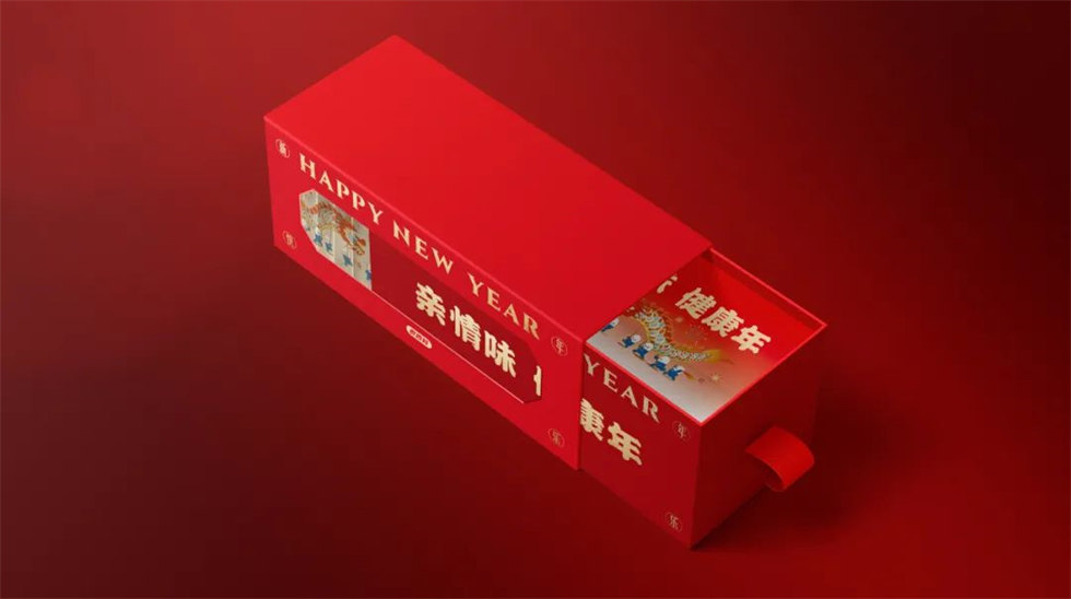 老百姓大藥房2024年新年禮盒包裝設計以“親情味,健康年”為主題,采用抽拉式禮盒結構設計。打開新年禮盒,左側的“舞龍折頁”緩緩拉開,開啟龍年新氣象。