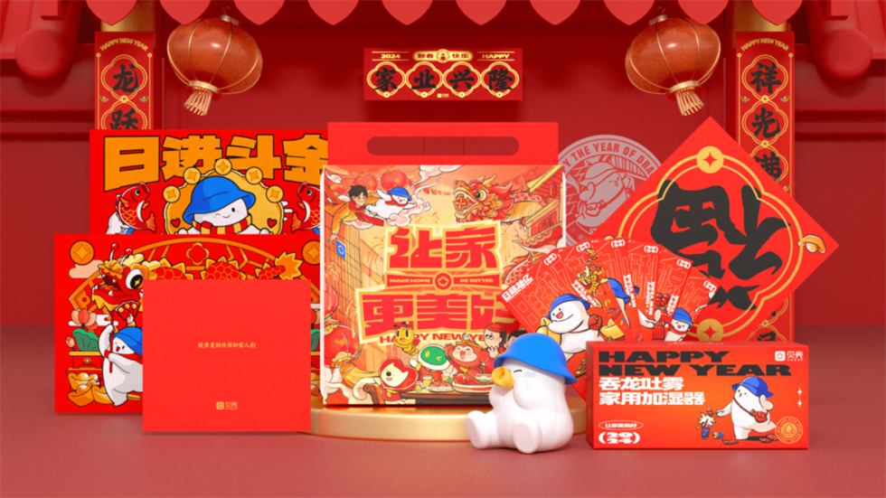 貝殼找房的2024新年禮盒包裝設計在中秋禮盒包裝設計的基礎上,增加了更多環保的概念。整體新年禮盒外包裝設計使用紙塑盒,主要材質是甘蔗渣,為地球的減碳增磚添瓦,這也是行業頭部企業社會責任感的體現。另外以王鬧海為IP設計形象的加濕器,可愛Q萌。兩款盲盒地墊,增加了新年的氛圍和趣味性。同時窗花,春聯這些年味的設計元素也沒有缺席。讓家更美好!