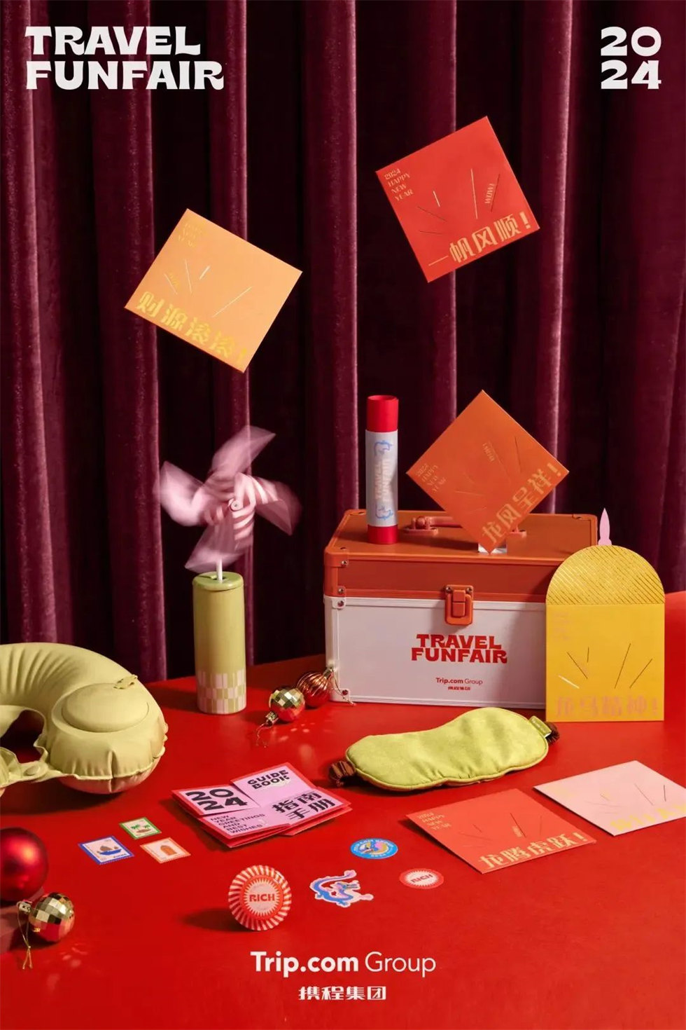「龍年游園會」禮盒包裝設計內含:旅行寶藏箱、RICH手機支架、頸枕眼罩旅行套裝、香氛花瓶、煙花風車、祝福紅包、新春對聯福字。