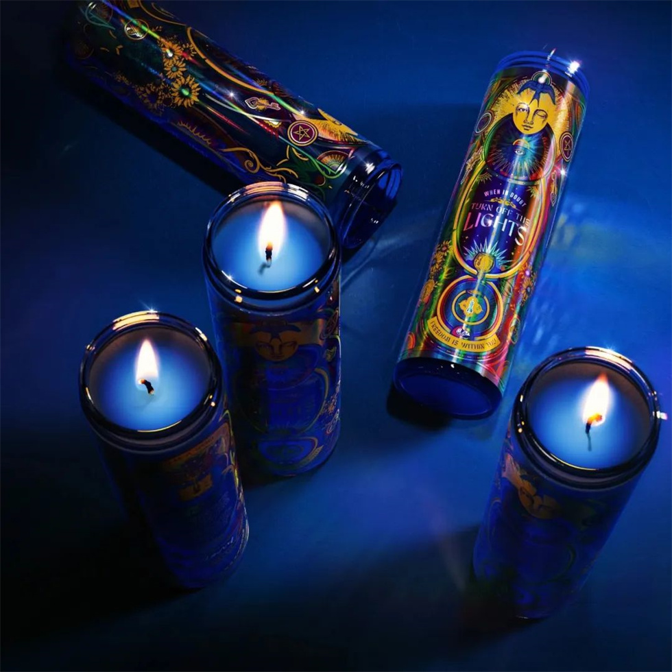 Leigh的蠟燭包裝設(shè)計(jì)融合了圣經(jīng)的意象,塔羅牌的象征,還有一些來(lái)自更廣闊的神秘世界,還有眨眼的修女——這是向瑪麗·科里塔·肯特修女致敬的幾種方式之一。