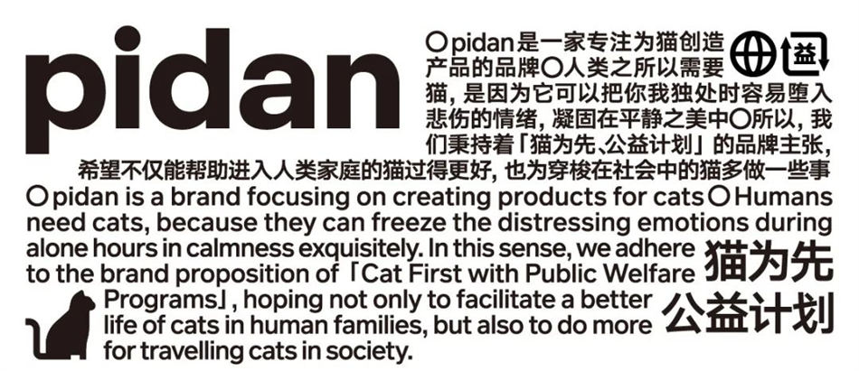 2022年,pidan重新定位為一家專注為貓創造產品的設計公司。相比在2018年的企業品牌形象設計中帶有的抽象圖形和色彩,本次的公司新視覺設計形象是極簡且具象的。pidan不再追求形式的變化,而是關注信息價值本身的高效傳遞。因此全新公司LOGO設計只有黑白配色,配以最基礎的文字信息。品牌視覺設計構成里抹除所有裝飾性元素,僅由貓的圖像和文字組成。