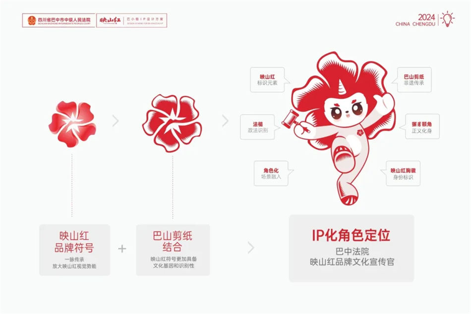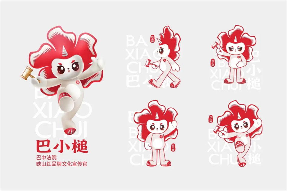 映山紅品牌所屬IP——“巴小槌”整體品牌設(shè)計(jì)形象基因來(lái)源于映山紅品牌文化標(biāo)識(shí)圖形,并融合了大巴山非遺剪紙藝術(shù)手法和正義瑞獸獬豸額角元素,一個(gè)發(fā)似紅花、手持法槌、胸戴映山紅,傳達(dá)著公平、正義、廉潔、活力滿滿的映山紅品牌小宣傳官呼之欲出,并通過(guò)角色的多形態(tài)、多場(chǎng)景、全媒體呈現(xiàn)出境,大力弘揚(yáng)新時(shí)代人民法院守正創(chuàng)新、開放包容的司法精神。