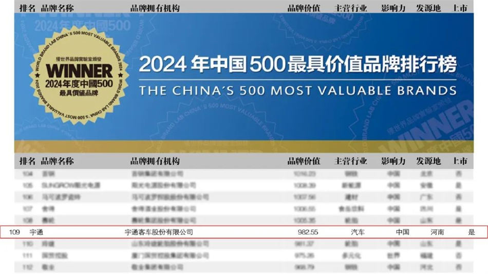 勤略品牌設計公司祝賀客戶宇通客車品牌價值超982億!位居《中國500最具價值品牌》排行榜第109位