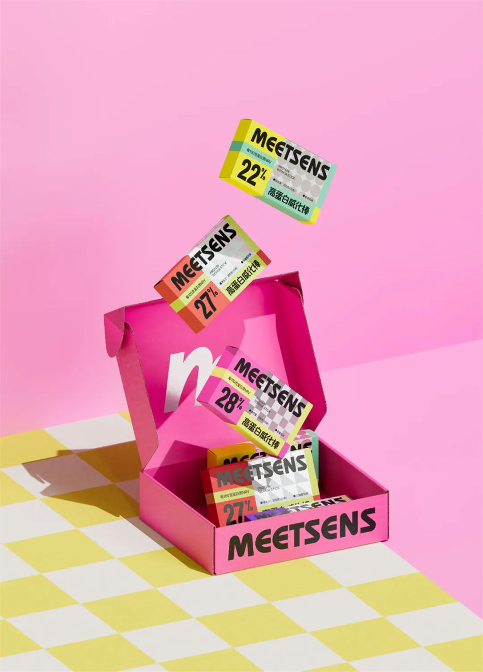 NDL在對Meetsens膳食品牌設計的過程中,充分考慮年輕消費者的審美偏好和購買習慣,運用色彩與幾何紋理的拼接手法,將文字信息合理模塊化,使得膳食品牌包裝既美觀又易于閱讀。同時,放大了蛋白質含量這一關鍵信息,以吸引那些注重健康飲食的消費者,營造出美味健康讓人心情愉悅的視覺感受圖片。