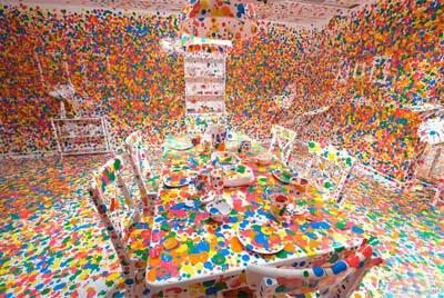 這是草間彌生(Yayoi Kusama)2013年在上海展覽的現場。觀眾可以從工作人員那里得到一些圓點貼紙,并且可以把它們貼在展廳的任何地方。這本身就是一件作品,觀眾也參與了創作。每個人都貼的很開心。這真的是讓人終生難忘的一個房間,從過程到效果有莫名其妙的歡樂氣氛。