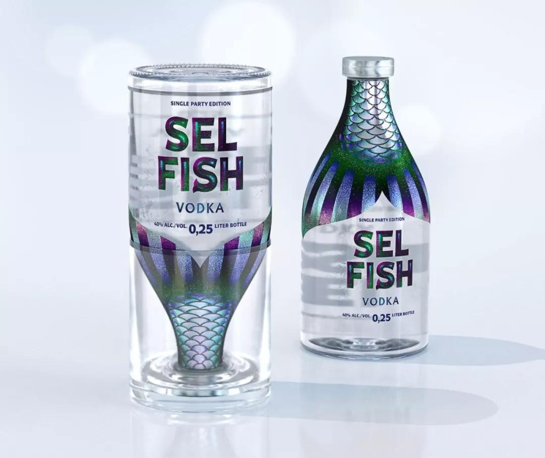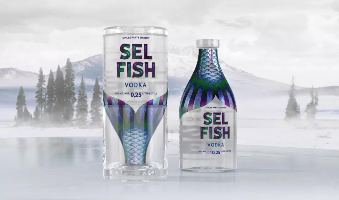 SEL FISH這款伏特加瓶身包裝設計得很有創意,以魚為靈感,將瓶子與玻璃杯融合在一起,瓶子上半身采用魚尾的圖案元素,使整體好似一條游動的魚的概念設計。并且這款伏特加只給一人份飲用,所以也與品牌形成雙關語。
