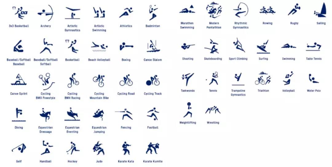2019年3月12日奧運會和殘奧會東京組委會公布了2020年東京奧運會的體育圖標。根據“和諧創新”的東京2020品牌承諾,東京2020年奧運會體育圖標是旨在巧妙地傳達每項運動的特征,以及從藝術上突出運動員的活力。