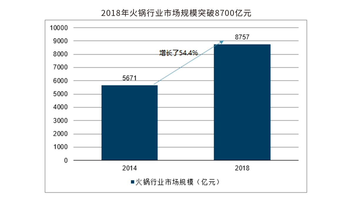 眾所周知,火鍋餐飲是餐飲細分中最大的品類,是餐飲行業(yè)的翹楚,2018年,全國火鍋業(yè)實現(xiàn)總收入8757億元,占餐飲市場份額的比重達到20.5%,而且火鍋餐飲行業(yè)還在持續(xù)增高,未來幾年火鍋市場有望迎來萬億市場空間。