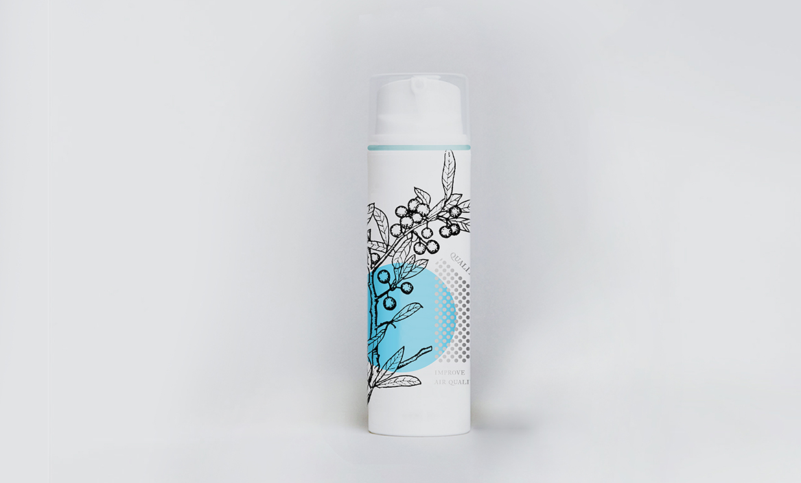 包裝設計定位:簡約、純粹、清新、自然。用產品成分代表植物留蘭香、龍葵花葉白描手繪特寫表達產品的自然屬性,幾何形狀的淺藍色代表湛藍潔凈的天空,點狀代表空氣和陽光,圓環代表光暈和水暈。