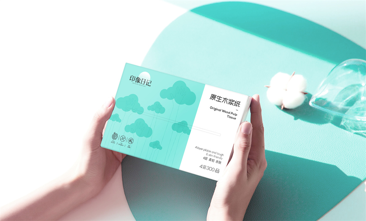 印象日記原生木漿紙包裝設計以“自然手護”為創作理念,用柔和的云朵與手構成大樹森林,風格自然、柔和、舒適,表達印象日記“原生、柔韌、親膚”的產品訴求。