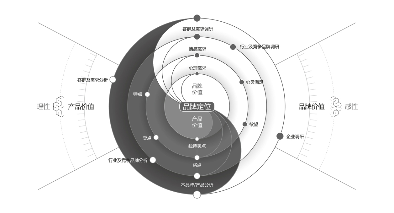 品牌是產(chǎn)品之上的一種情感認(rèn)同,因價值而存在,因思想而傳承。品牌策劃是一個為品牌找魂的過程,找到能體現(xiàn)消費(fèi)者欲望的、企業(yè)可滿足的、同時未被滿足的品牌核心價值定位。一個完整的品牌策劃,必須先由表及里,層層挖掘,直至核心,找到其獨(dú)特的核心價值,然后基于競爭在消費(fèi)者的心智中恰當(dāng)?shù)钠放贫ㄎ唬賴@品牌定位由內(nèi)而外準(zhǔn)確的思想表達(dá),將品牌核心價值語言化,滿足需求,創(chuàng)造欲望。